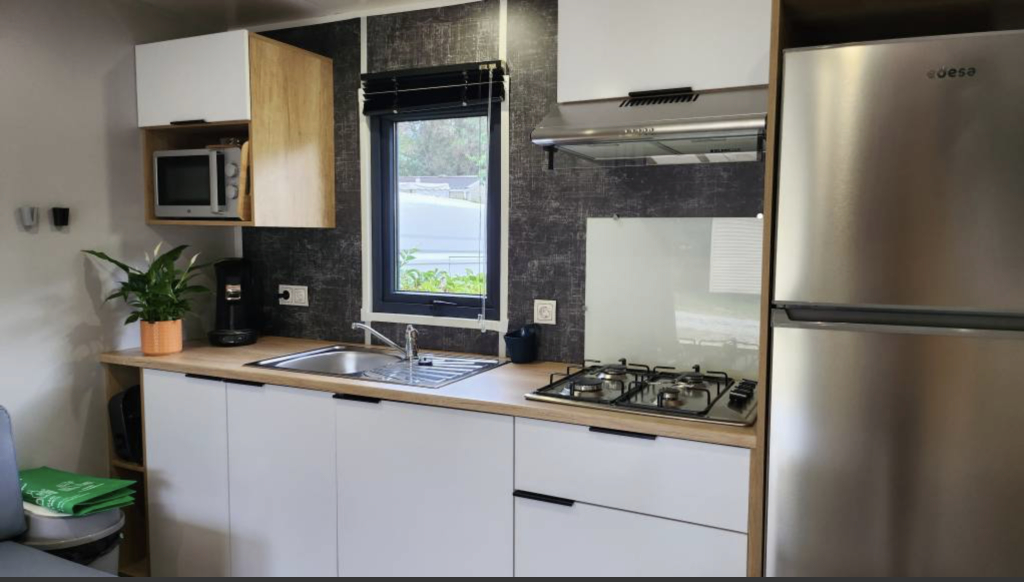 Equipement : Climatisation (en option),frigo-congélateur, cafetière senseo, micro-ondes, gazinière 4 feux.